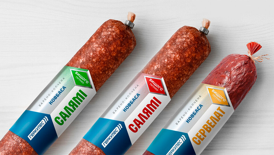 Дизайнеры KOLORO создали лаконичную и модерновую этикетку, которая объединяет все линейки колбас «Геркулес» и выделяет их на фоне конкурентов.