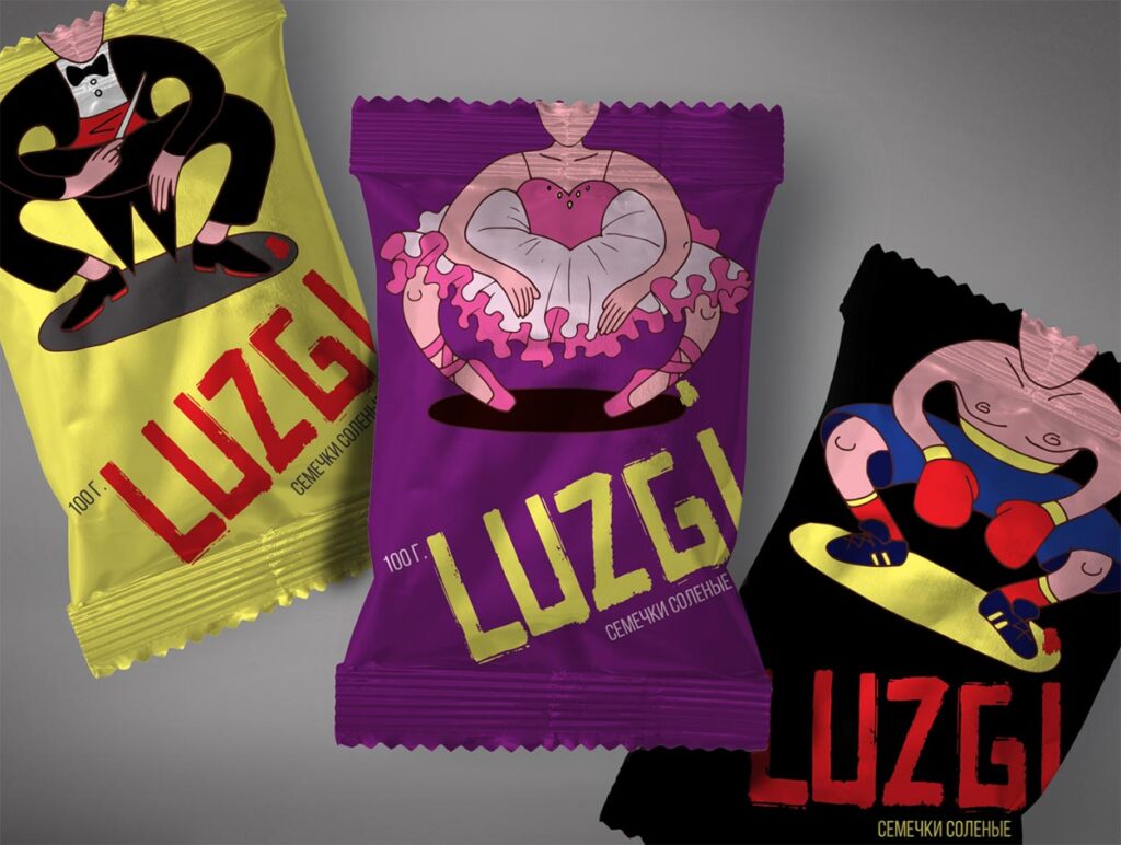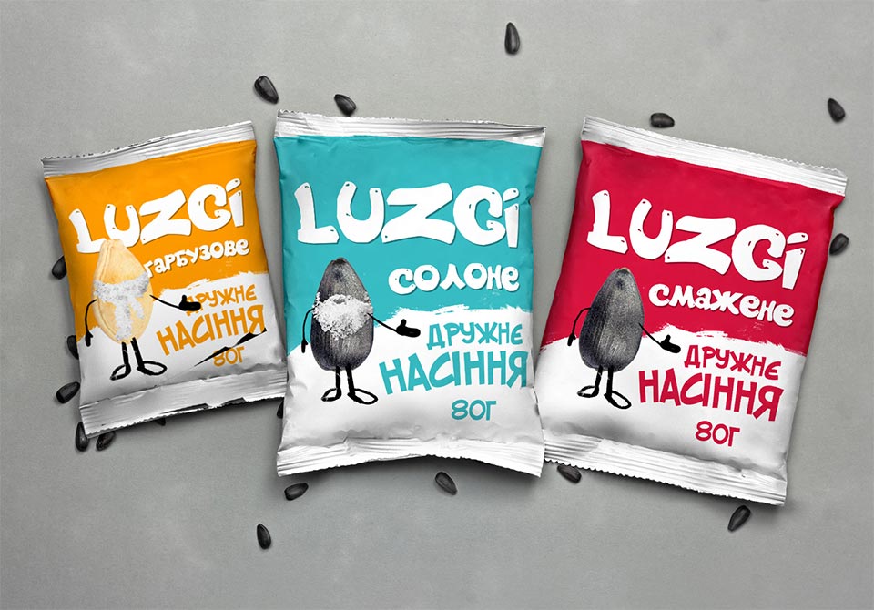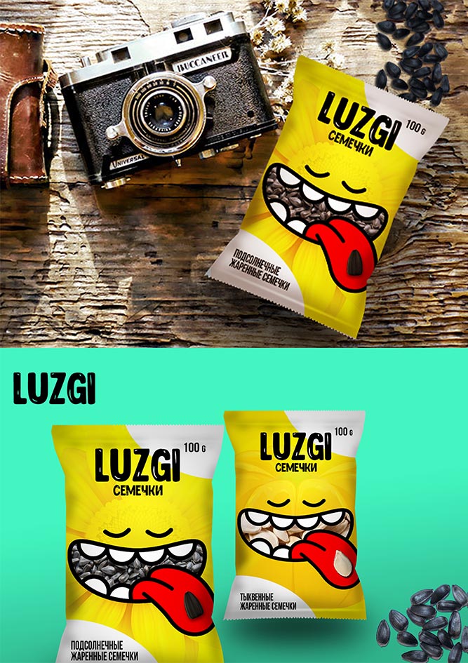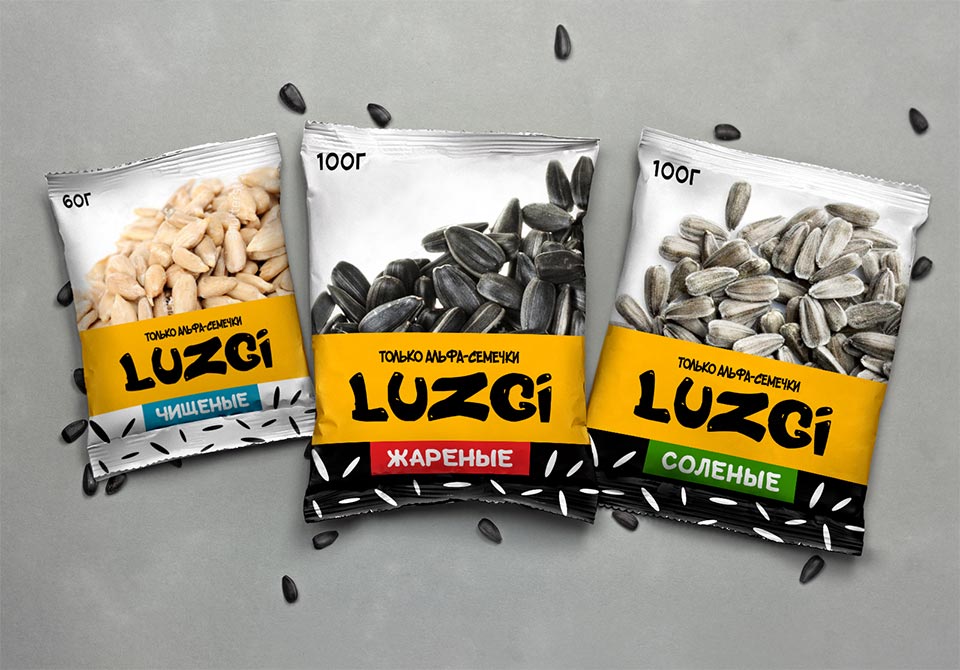 Больше остальных концептов клиенту понравился «LUZGI дружественные семечки». Цветовая гамма состоит из белого и еще одного яркого цвета (зависит от вида продукта). Шрифты крупные, с мягким жирным начертанием.