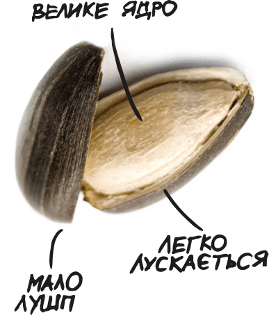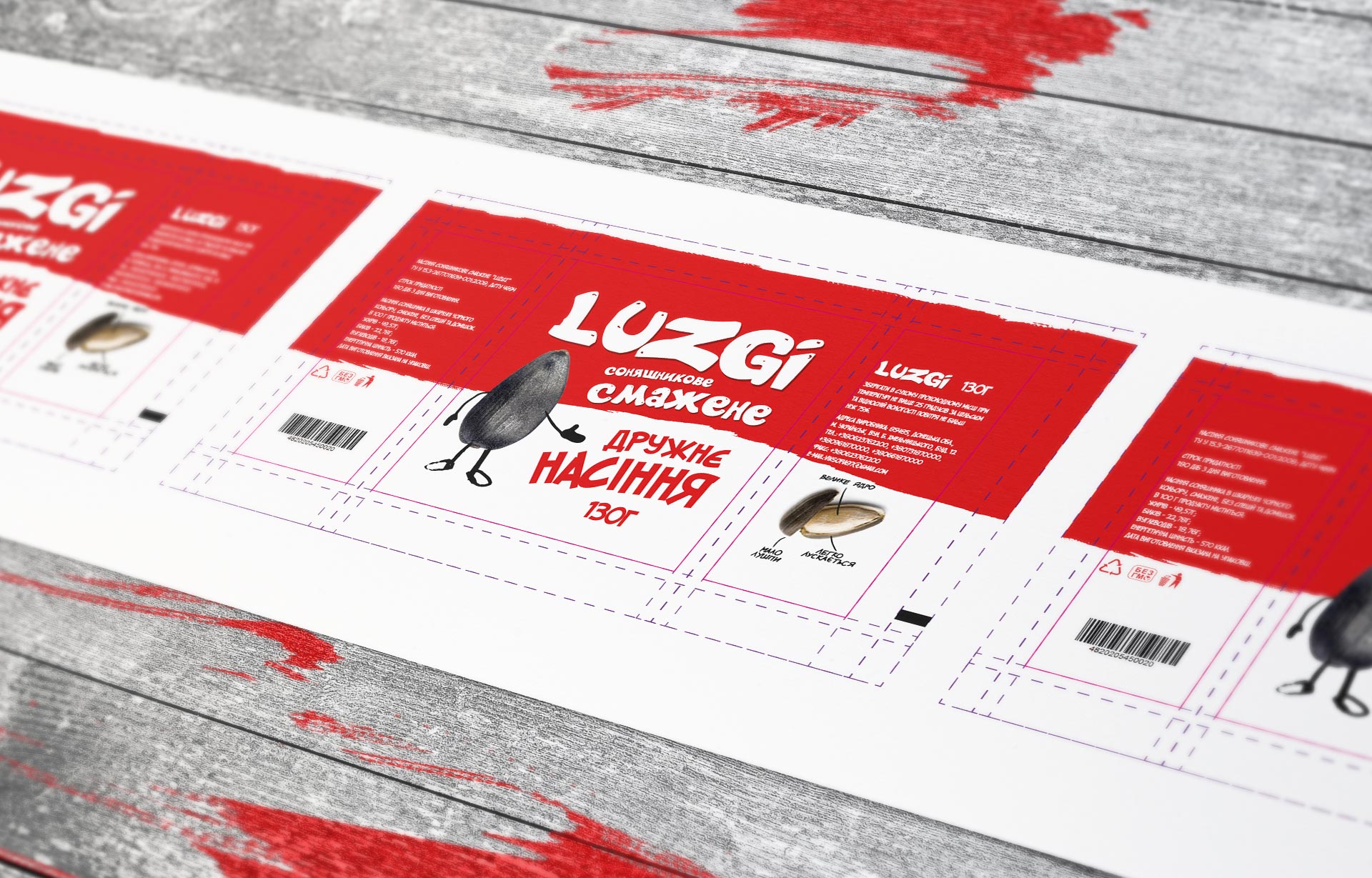 На обороте упаковки размещена небольшая инфографика — очищенная семечка в окружении подписей «Легко лущится», «Мало шелухи» и «Большое ядро». То есть LUZGI не только вкусные и натуральные, их еще и приятно есть, отдыхая наедине или в компании.