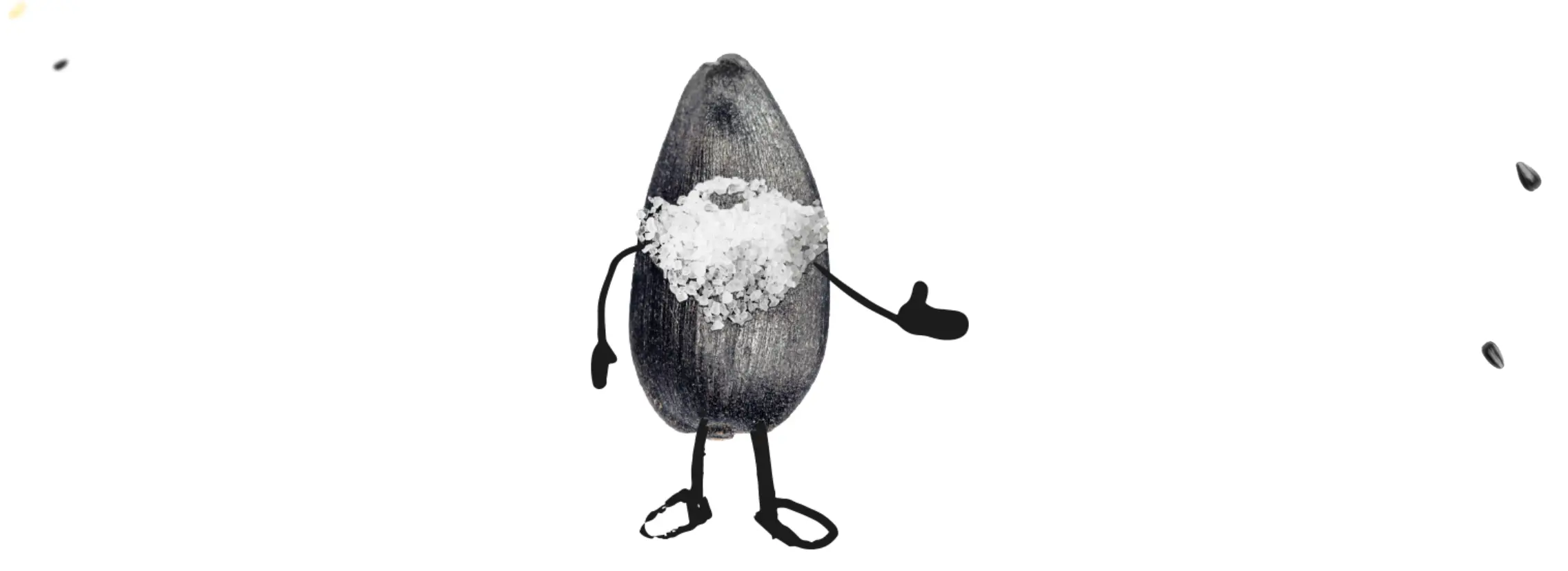 Бирюзово-белая цветовая гамма. Персонаж— черная подсолнечная семечка с «бородой» из соли